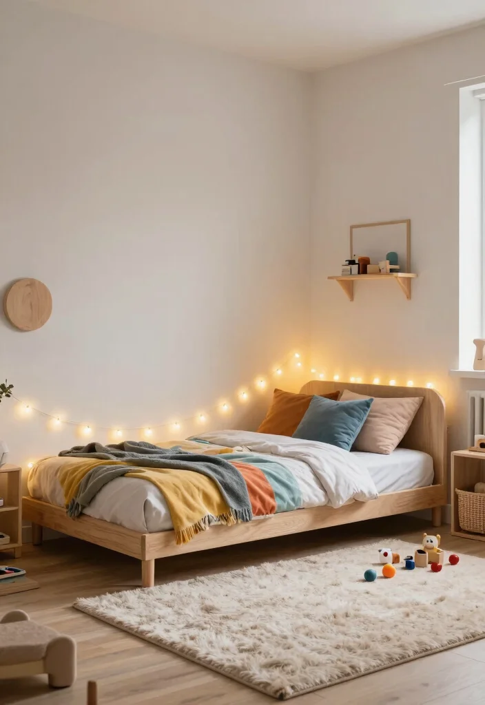 To enhance this calming effect, avoid harsh fluorescent lighting and instead opt for warm LED bulbs that create a cozy glow. Incorporate a floor mat for safe play and select natural materials like wool and cotton for bedding to promote a healthier atmosphere.