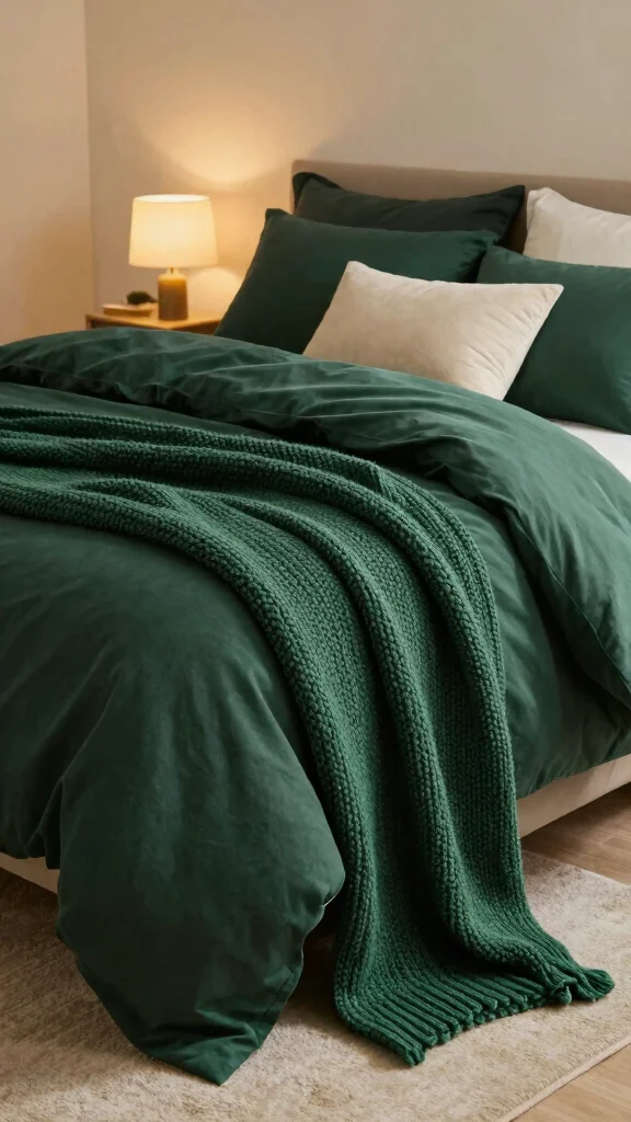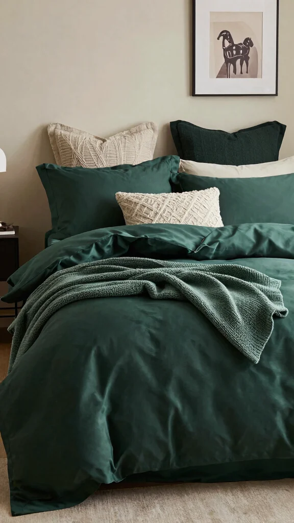 Layering different textures can add depth and warmth to your bedding. Combine a plush dark green duvet with a textured throw or a knitted blanket for a cozy feel. Consider adding pillows in various fabrics, such as linen or faux fur, to create an inviting look. A mix of textures will give your bedding a rich, sophisticated appearance.