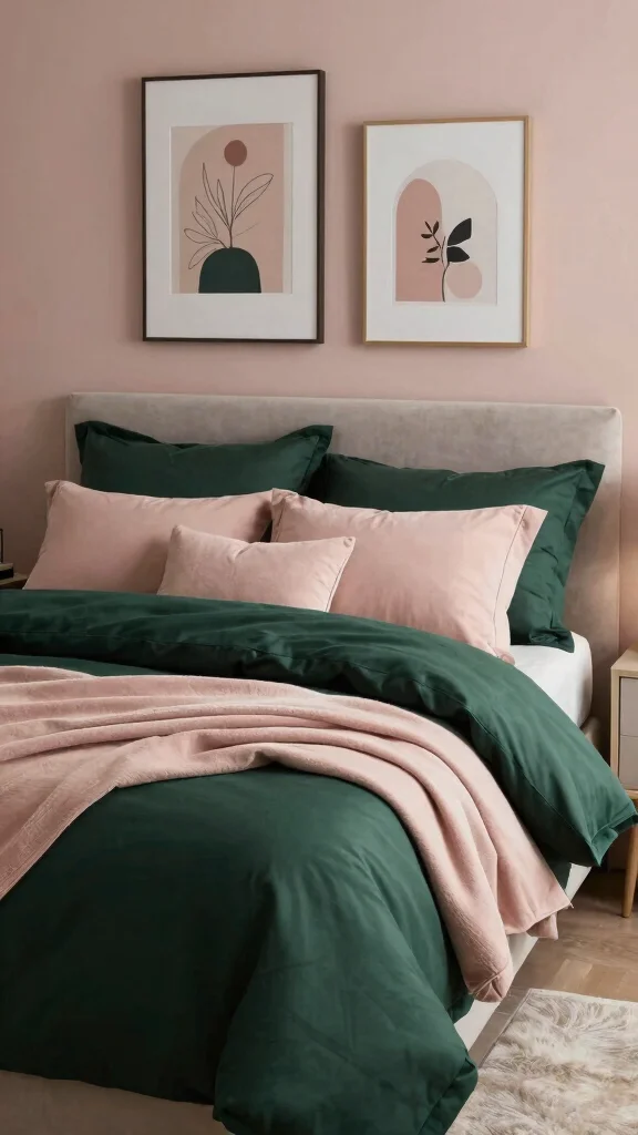 Combining dark green bedding with blush accents creates a stunning, rich color palette that radiates elegance. The softness of blush against the depth of dark green establishes a beautiful balance, perfect for adding romance to your bedroom.
