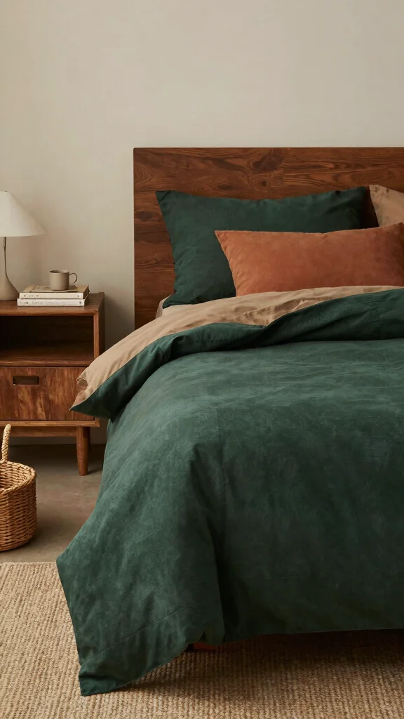 Celebrate the beauty of nature by pairing dark green bedding with earthy tones. This blend reflects rustic charm, harmonizing colors like terracotta, ochre, and warm browns with rich green. Introduce earthy accents through accessories like ceramic vases, woven baskets, or wooden furniture.