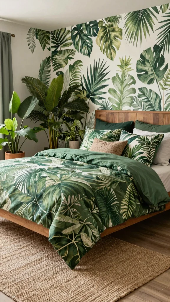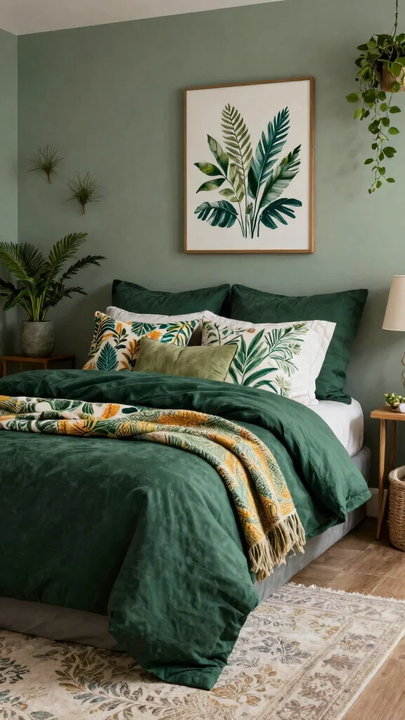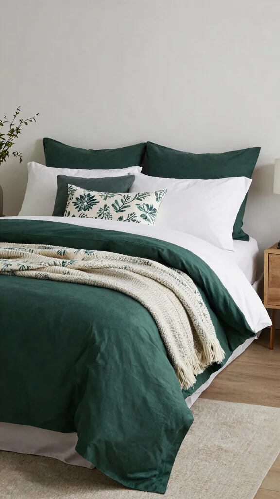 For nature lovers, combining dark green bedding with botanical prints creates a stunning focal point. Start with dark green as your base, then layer in patterned throws and pillows featuring vibrant floral or tropical designs. This combination not only brings the outdoors in but also adds a lively personality to the room.