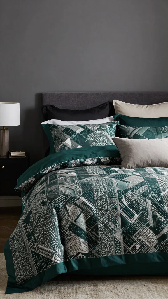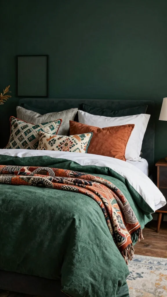 Introduce a dynamic element to your bedroom by layering patterns alongside your dark green bedding. Mixing floral, stripe, and geometric patterns can create an eclectic yet harmonious look. The key is to keep colors within the same family to ensure visual cohesion.