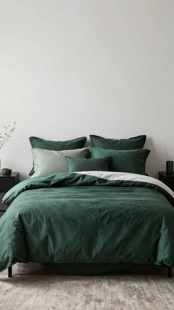 For a minimalist aesthetic, dark green bedding stands out brilliantly against a neutral backdrop. This design focuses on clean lines and simplicity, utilizing dark green as a defining feature. Keep other decor elements minimal to allow the beauty of the bedding to shine through.
