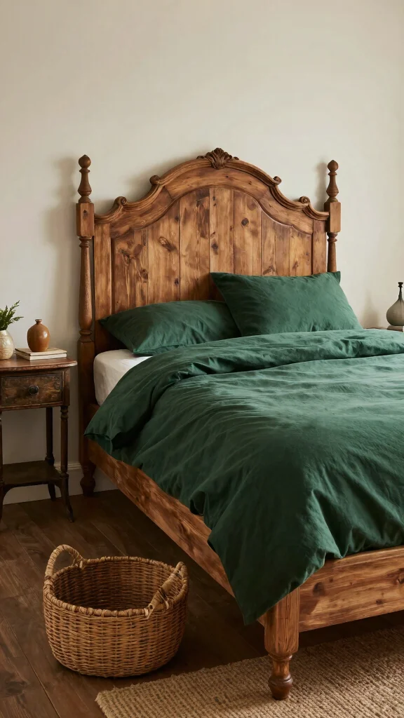 Embrace rustic charm by merging dark green bedding with wooden accents and vintage decor. A wooden headboard set against dark green bedding creates a warm and inviting atmosphere. Layer in soft earth-toned throws and pillows for a cozy retreat that feels welcoming and comfortable.