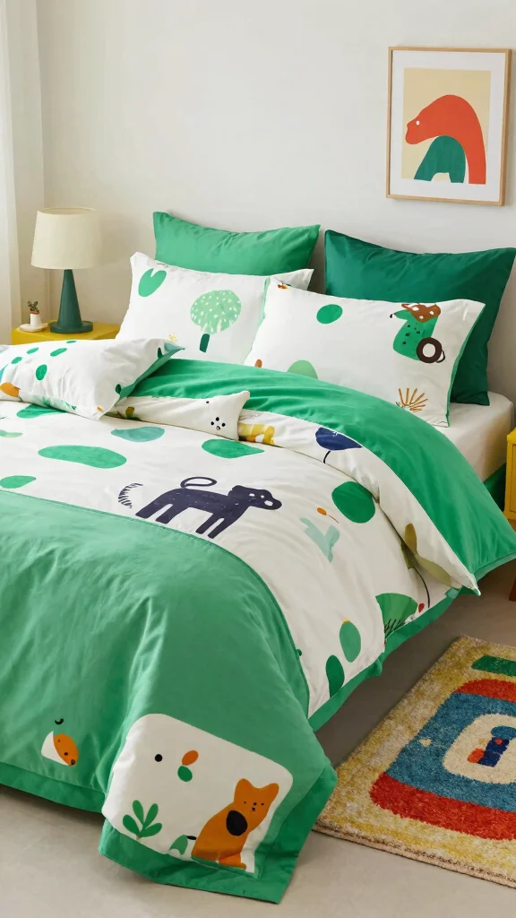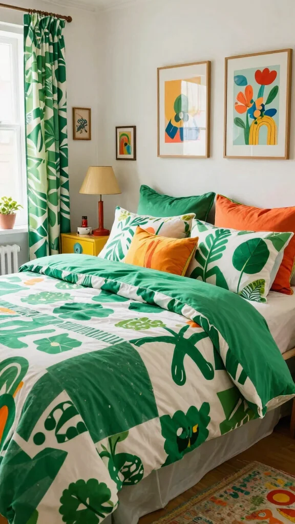 Introduce a playful spirit to your bedroom with whimsical patterns in green and white. Fun designs can range from abstract shapes to charming animal motifs, infusing your space with personality and charm. Pairing these lively patterns with solid-colored accessories helps balance the energy in the room. Incorporating quirky decor items, like whimsical artwork or playful figurines, can enhance the overall theme and make your space uniquely yours.
