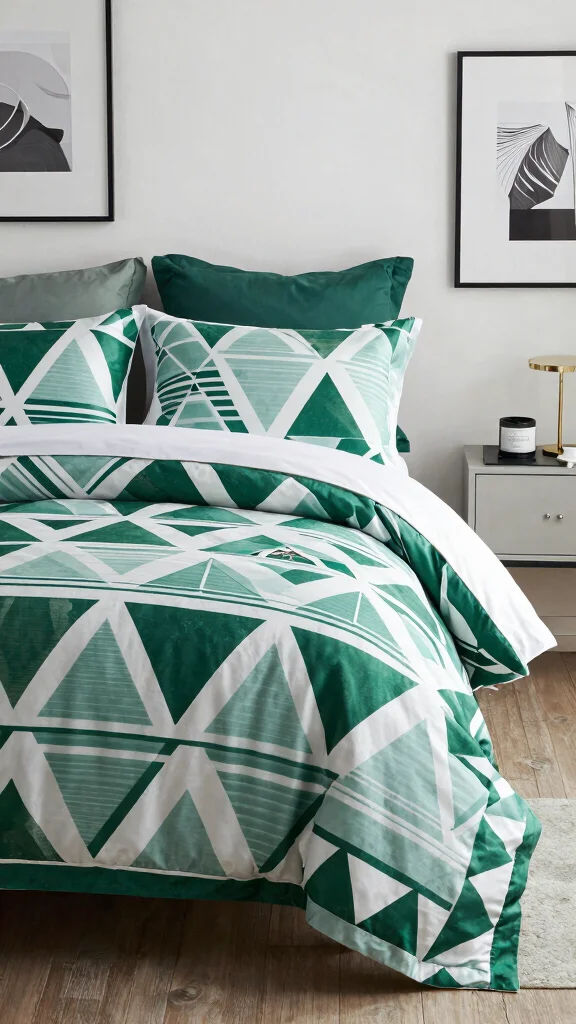 For a contemporary touch, select green and white geometric patterns for your bedding. Geometric shapes introduce a sense of modernity and order, making your bedroom feel stylish and organized. This bedding style pairs well with clean lines and minimalist furniture, creating a cohesive, modern aesthetic. Choose bold patterns for a striking statement or softer geometric designs for a more subtle effect.