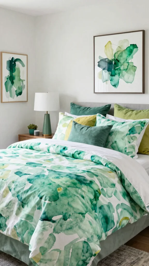 – Choosing bedding that features earthy patterns or colors alongside green and white.