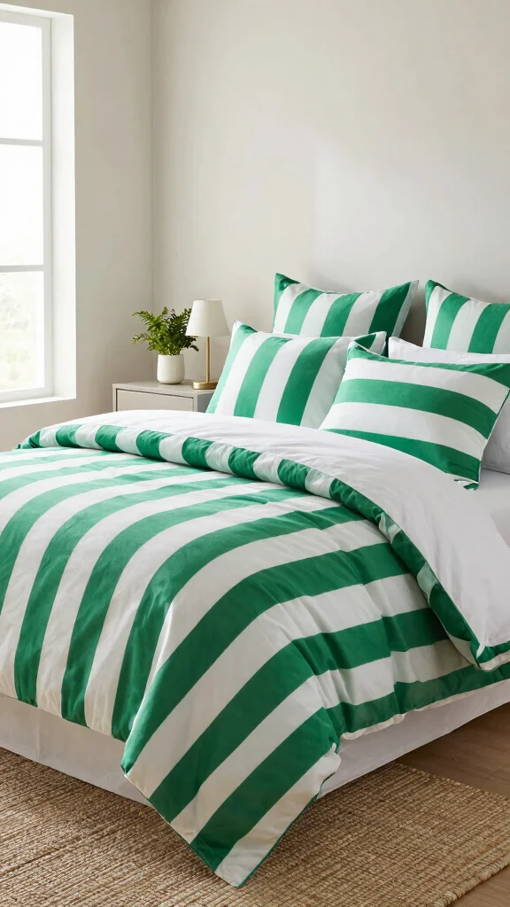 Stripes in green and white bring a classic yet modern touch to your bedroom. This timeless pattern can visually elongate your space, creating an airy and spacious feel. Combine the striped bedding with solid-colored accessories for a balanced look. Opt for varying widths of stripes to introduce playful sophistication while maintaining elegance.