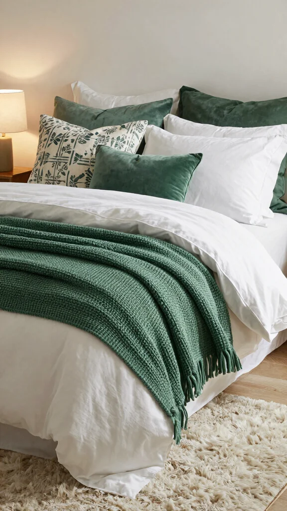 Elevate your bedding game by layering various textures in green and white. Combining different fabrics like cotton, linen, and velvet creates a cozy and inviting bed that beckons you to relax. Texture-rich pillows not only provide comfort but also enhance the visual appeal of your decor. Remember to consider the weight of your textiles: heavier blankets for winter, lighter fabrics for summer.