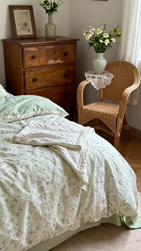 Infuse your bedroom with nostalgia through vintage-inspired green and white bedding. Romantic florals or classic checks evoke timeless charm, especially when paired with antique furniture or rustic accents. This approach not only enhances the warm, homely feel but also aligns with eco-conscious choices like organic cotton for a stylish yet sustainable option.