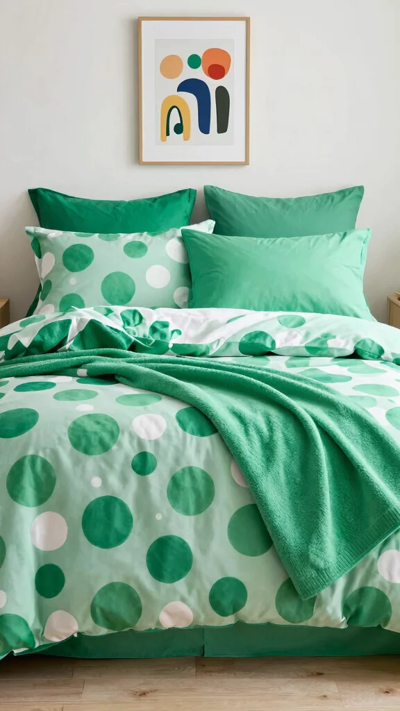 Bring a sense of fun to your bedroom with green and white polka dot bedding! This lively design can create a cheerful atmosphere, enhancing your space’s overall mood. Balance the whimsy of polka dots with solid-colored accessories for a cohesive look. Mixing different dot sizes adds visual interest and invites personal expression while keeping the design fresh and lively.