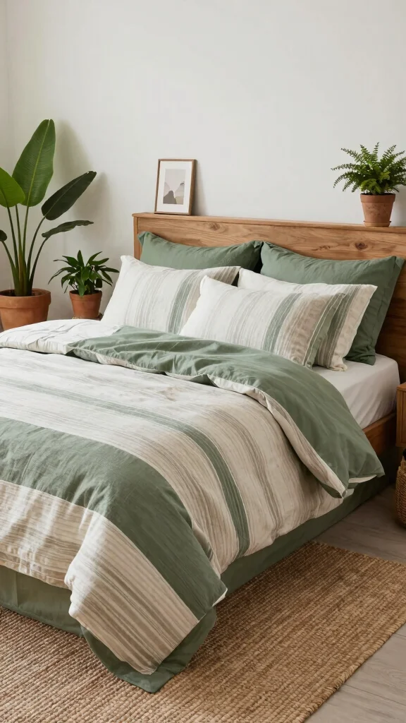 Begin with a green and white bedding base, then choose home textiles that are sustainably produced—think organic cotton, hemp, or linen with responsible dyes. Mix textures through a linen duvet, percale sheets, and a cotton or wool throw to add depth without clashing colors. Incorporate natural materials like wood furniture and jute rugs, keep the color palette limited to greens, whites, and neutrals, and add life with plants for a durable, timeless look in your sustainable home decor.