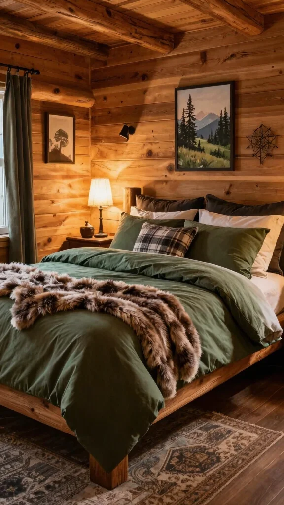 Layering blankets is an effective way to add depth and comfort to your bedding. Start with an army green comforter or duvet, then introduce a lighter blanket or a plaid throw for a dynamic visual appeal that’s perfect for a masculine room.