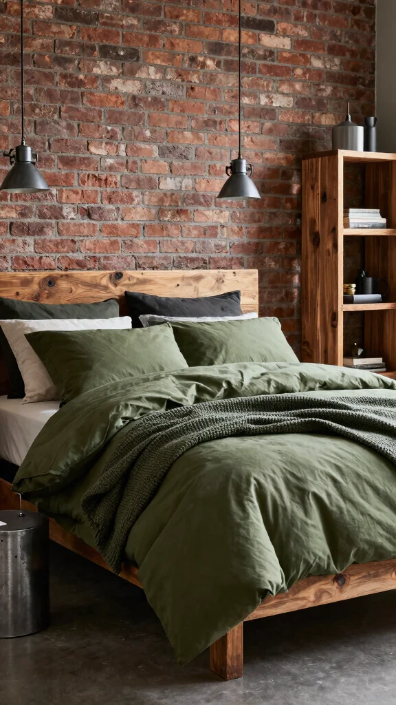 Start with a strong anchor: let army green bedding be the focal point. Use a neutral wall and dark furniture to make the green pop. Layer textures with a quilted duvet, a knit throw, and a rugged headboard to enhance the masculine vibe. Bring in masculine bedroom decor elements like metal lighting, clean-lined furniture, and simple hardware. If you introduce patterns, pick one bold piece in modern camouflage patterns and keep the rest solid, so the look stays cohesive. Finally, tie in an earthy color palette with charcoal, cocoa, and tan accents to balance the army green bedding without overpowering the room.