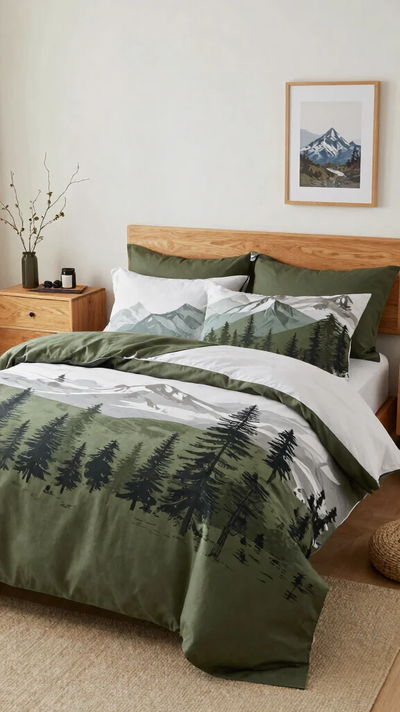 Pair outdoor-inspired bedding with natural wood furniture and earthy decorations to enhance the theme. Incorporate decorative elements like hiking gear or maps for an adventurous touch.