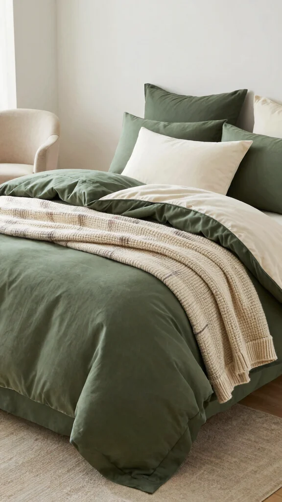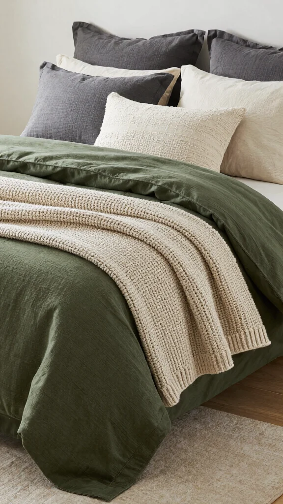 Experimenting with various shades of green or complementary colors in your layers will create an inviting look. A knitted throw adds warmth and texture, while a lightweight blanket keeps the arrangement feeling airy.