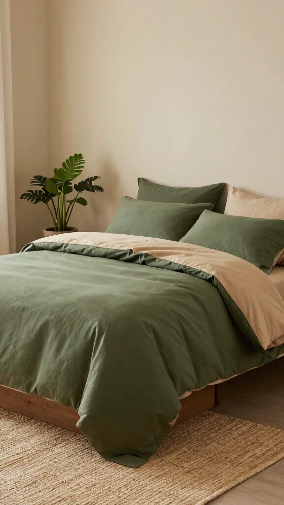 Use a cohesive color family, focusing on earthy color palettes and army green home accessories that echo the bedding.