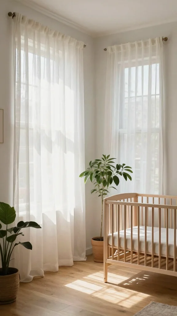 Incorporating sheer organic cotton curtains can beautifully diffuse sunlight while providing privacy. Proper airflow is equally important, helping maintain a fresh environment that promotes your baby’s health.