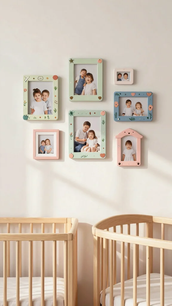 Involve older siblings in painting the frames to make it a family bonding activity. Choosing frames in different shapes and sizes adds a fun, eclectic look that keeps the decor lively.