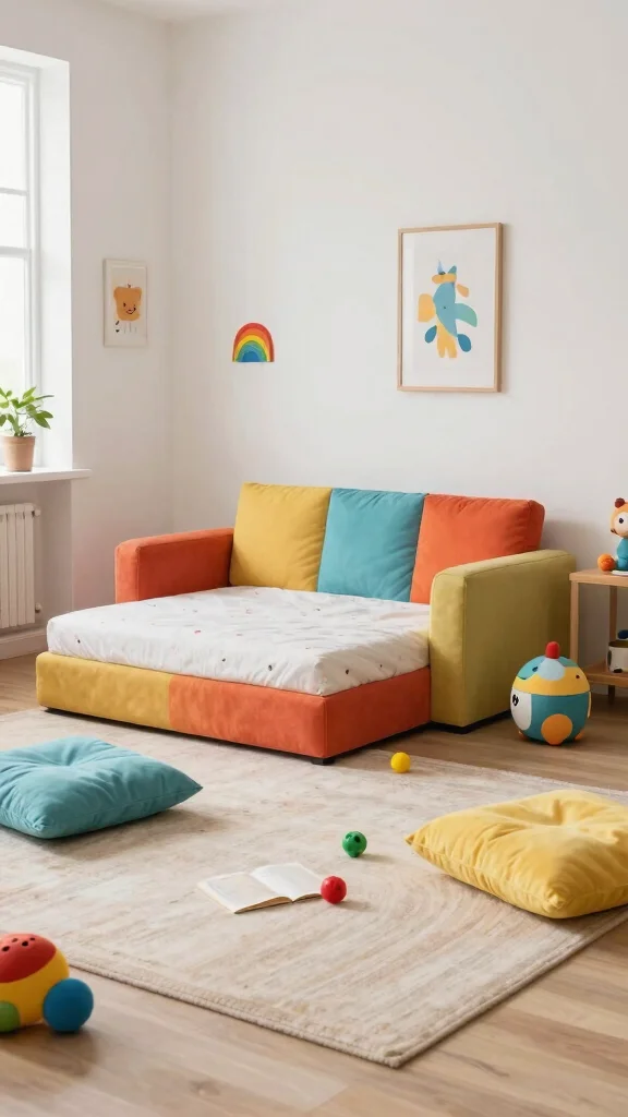 Design a baby room that doubles as a playful area with a sofa bed that encourages both fun and relaxation. Soft flooring can provide comfort during playtime, while a colorful sofa bed complements this lively environment. Create designated zones for sleeping, playing, and reading to foster a well-organized space. Implement accessible storage solutions, such as bins or shelves, for little hands to easily reach.
