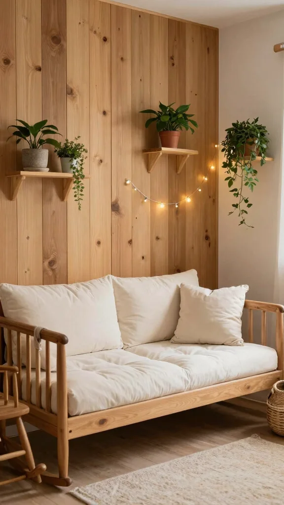 Transform your baby room into a serene, nature-inspired retreat with a sofa bed that highlights earthy tones. Envision greens, browns, and natural textures that contribute to a peaceful environment perfect for relaxation. Integrate wood elements, such as a wooden sofa bed and shelving, while adding soft greenery through house plants to enhance the natural vibe. Choosing organic materials for textiles further enriches the space’s connection to nature.