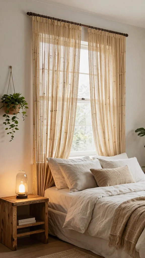 Hang bamboo beaded curtains by your window and watch the light soften without fading the view—calm and cozy in minutes. A quick swap from blinds with soft earth tones keeps your bedroom serene and ready for a peaceful night’s rest.
