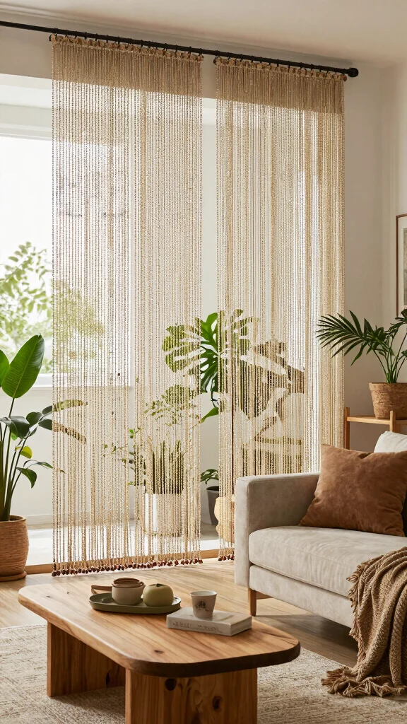 To incorporate this charming style, consider mixing various bead sizes for an eye-catching look. Pair these curtains with calming greens, browns, and creams to create a seamless design. Not only do they elevate your decor, but they also act as sound dampeners, ensuring privacy while maintaining a peaceful atmosphere.