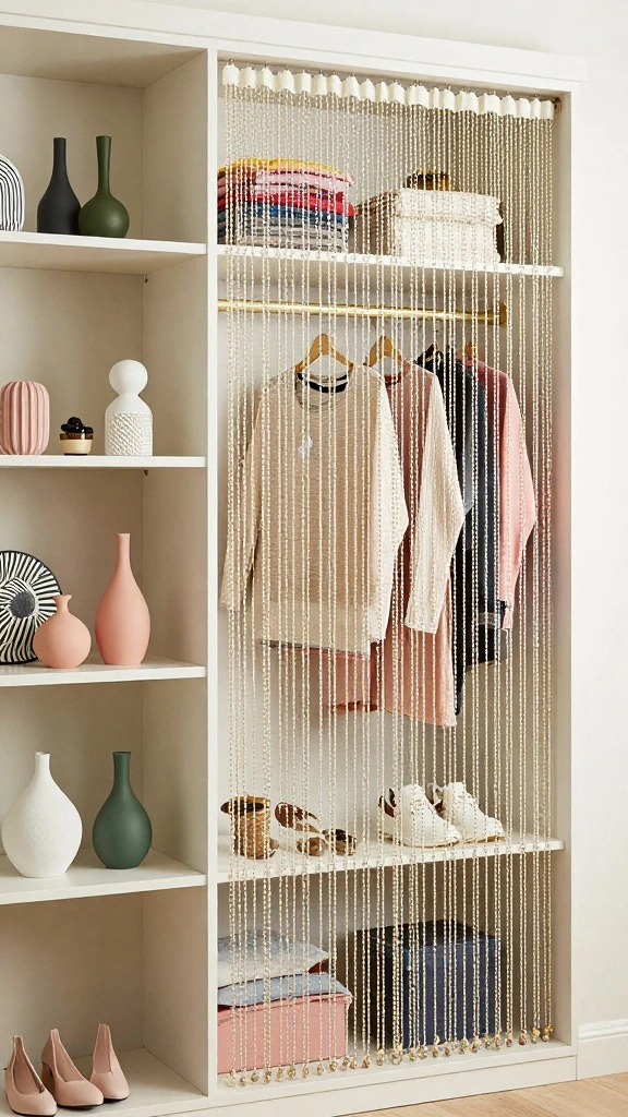 Combine beaded curtains with shelving to create a stylish and multi-functional closet space! This setup not only keeps your clothes organized but also adds an aesthetically pleasing backdrop for your belongings. Imagine the harmony of colors and materials coming together to form a cohesive look.