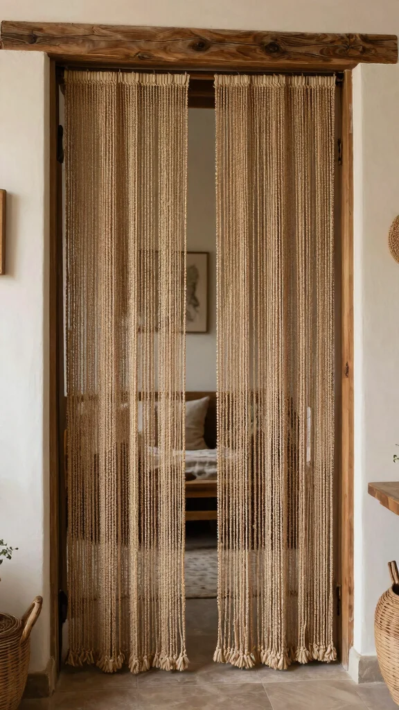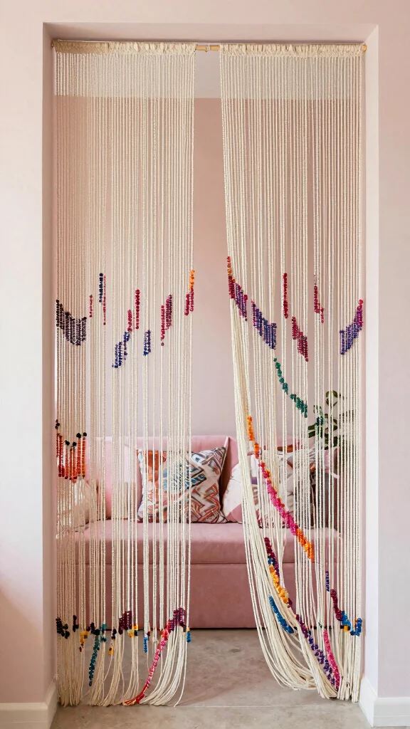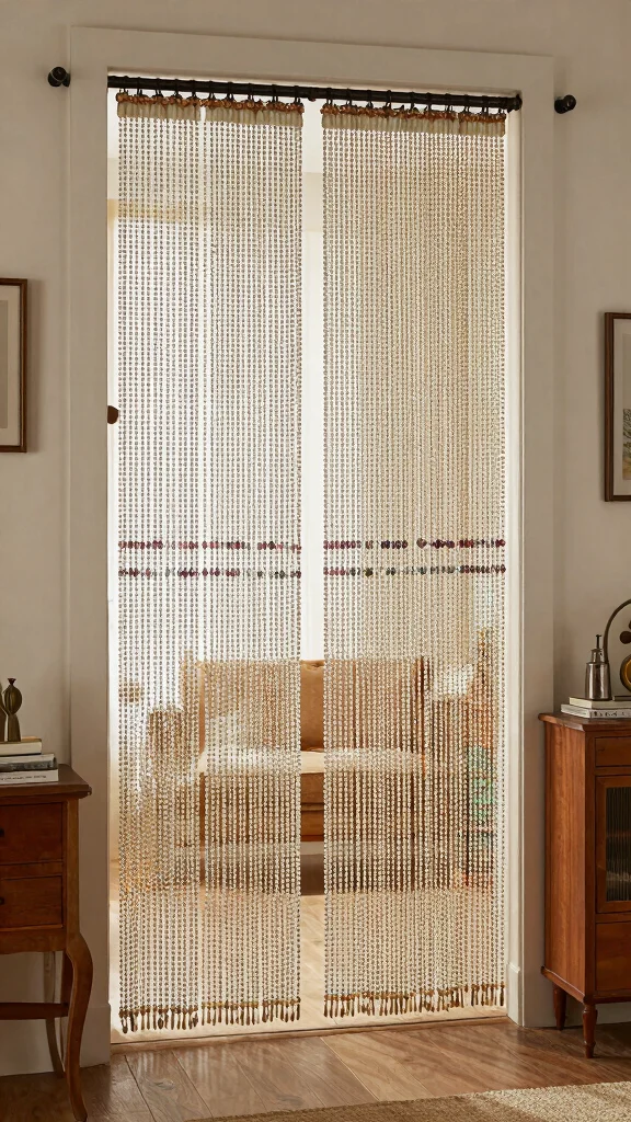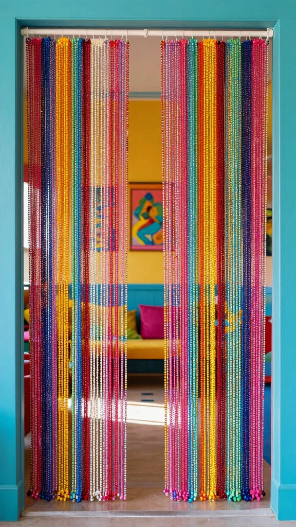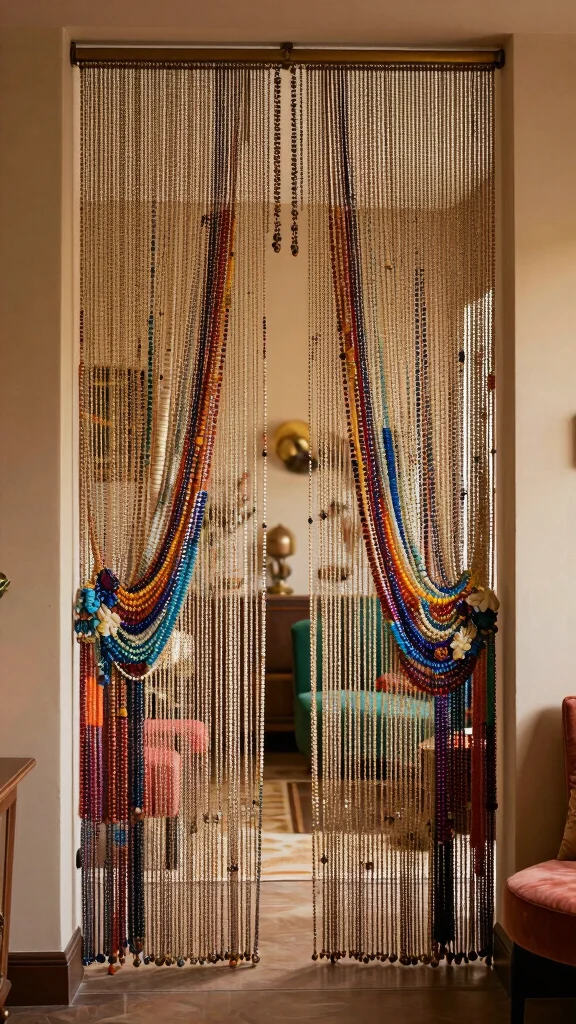 These curtains are perfect for both living rooms and bedrooms, offering a unique way to segment spaces in open-concept designs. For a budget-friendly option, consider making your own by mixing various bead styles and lengths.