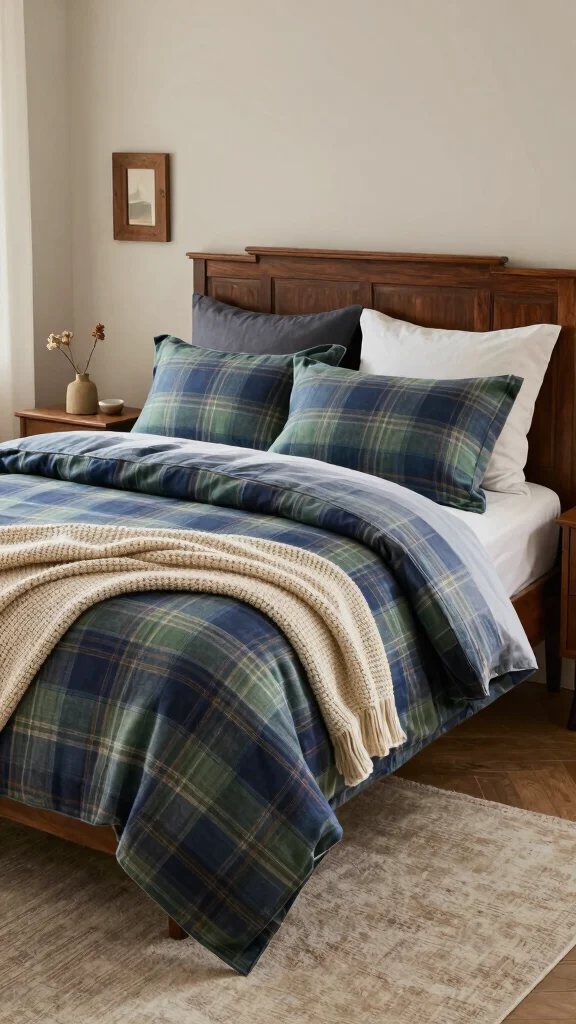 To balance the look, pair plaid bedding with solid color sheets and throws. Adding vintage or wooden furniture enhances the cozy feel while maintaining a chic appearance. A textured throw or knitted blanket can add warmth and style.