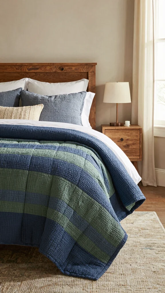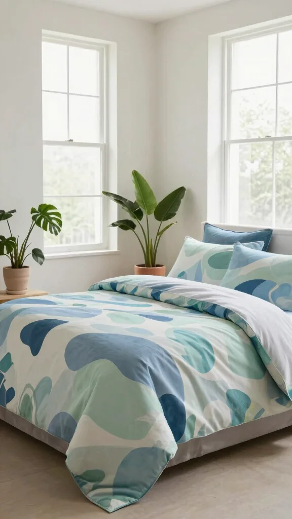 Introduce soft abstract designs in blue and green to your bedding for a modern and artistic touch. These unique patterns add depth and interest without overwhelming the space, making them an excellent choice for contemporary decor. Look for bedding featuring soft, flowing abstract shapes in muted colors to maintain a serene vibe.