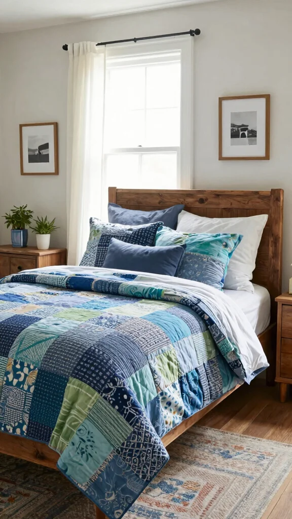 Patchwork bedding that combines various blue and green patterns creates a fun and unique visual appeal in your bedroom. This eclectic style showcases creativity while maintaining a cozy atmosphere. The mix of different fabrics and styles can make your bed a captivating focal point.
