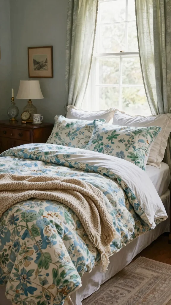 Pair vintage floral bedding with similarly muted sheets to maintain a cohesive look. Incorporate antique furniture pieces or vintage decor to amplify the overall charm. Soft, warm lighting can further enhance the inviting feel of the space.