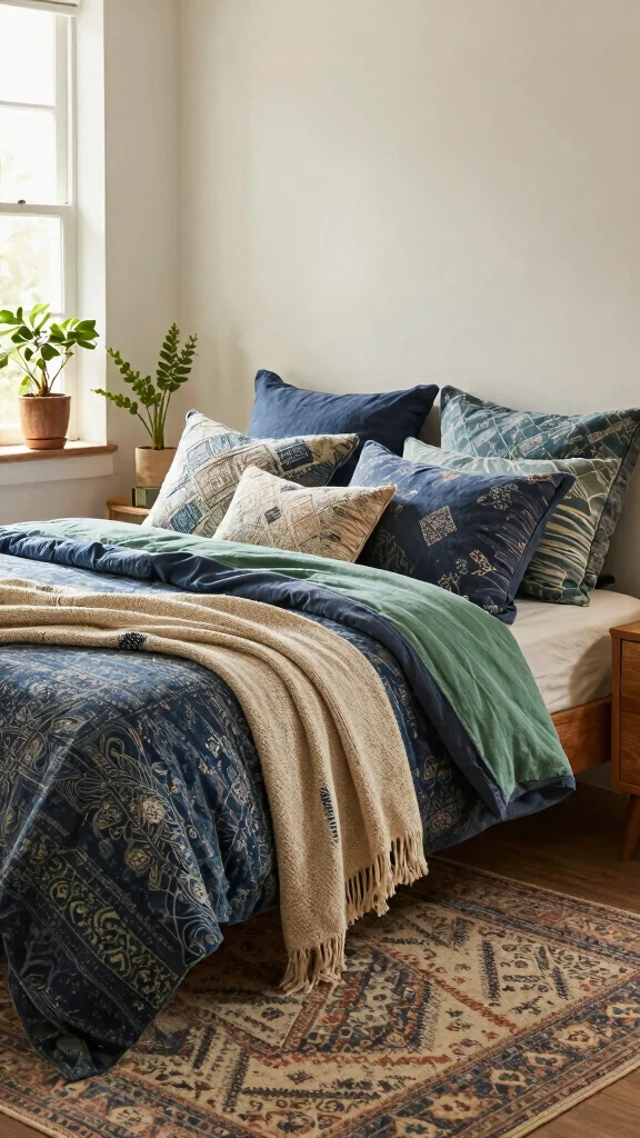 Craft an inviting bedroom atmosphere by layering various blue and green bedding in bohemian styles. Mixing patterns, textures, and colors not only adds depth but also creates a warm and cozy environment. Picture plush blankets over a patterned duvet, coupled with an array of decorative pillows that enhance the eclectic look.