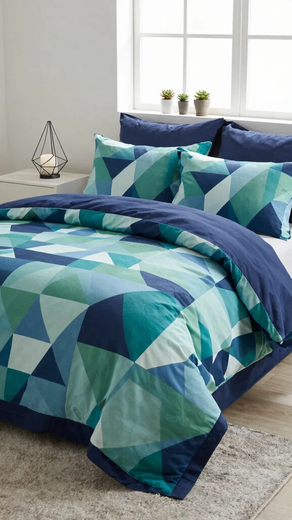 Add geometric patterns for a modern touch, balancing the softness of blue and green bedding with structure.