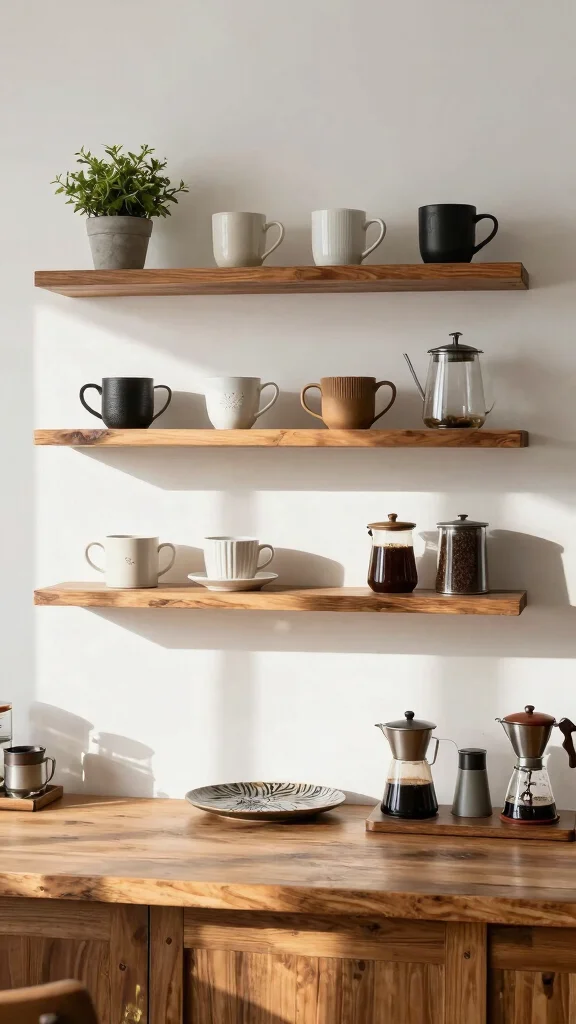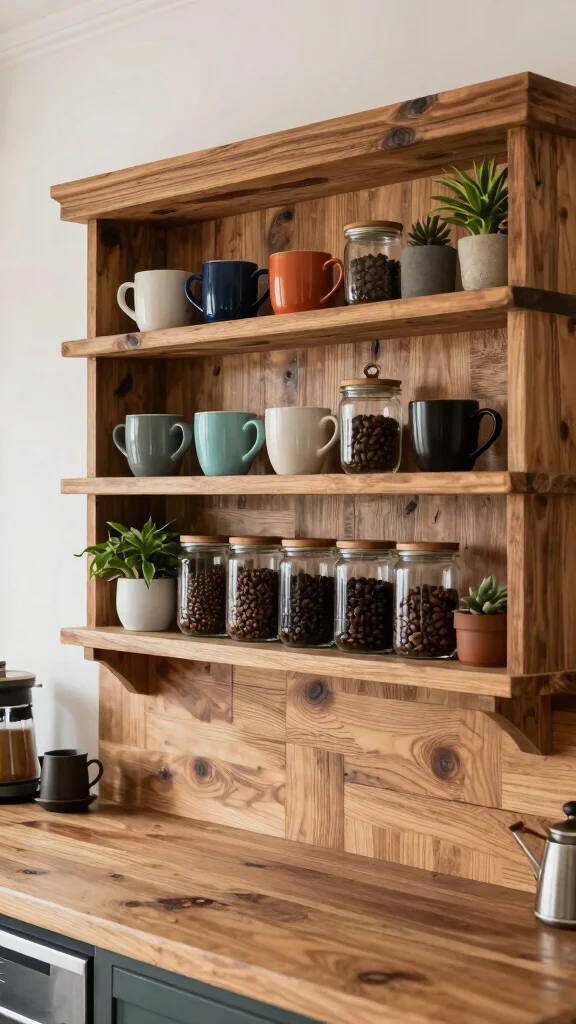 To make the most of this design element, consider adding hooks for hanging mugs below the shelves. Vary the heights of the shelves to create a dynamic display. You can also incorporate small plants or artwork between your coffee items for a creative flair.