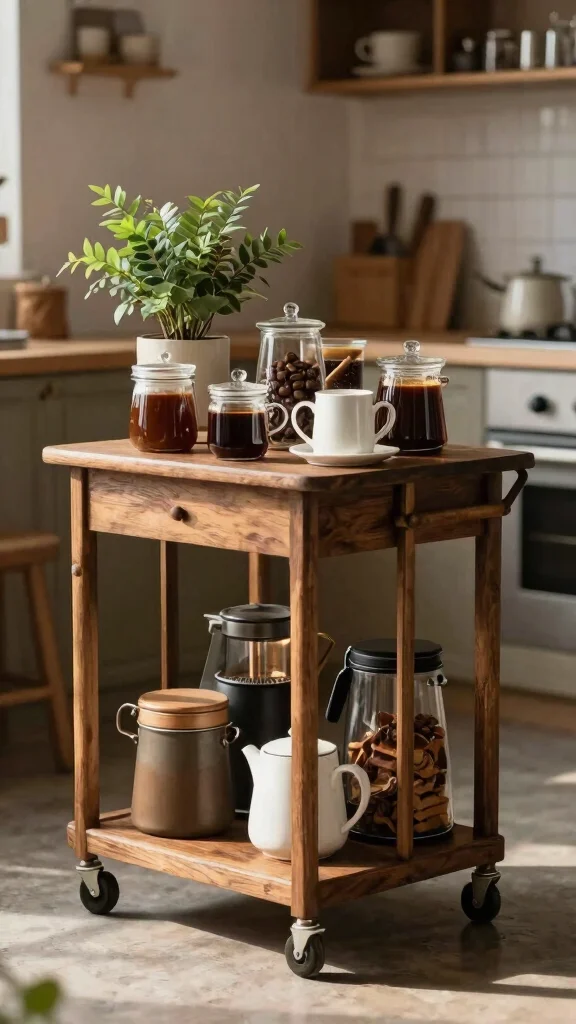 A multi-functional coffee cart adds versatility to your coffee station while providing extra storage. This mobile piece can hold everything from coffee supplies to snacks, making it a practical addition to your kitchen. Choose a cart that complements your rustic decor style for a cohesive look.