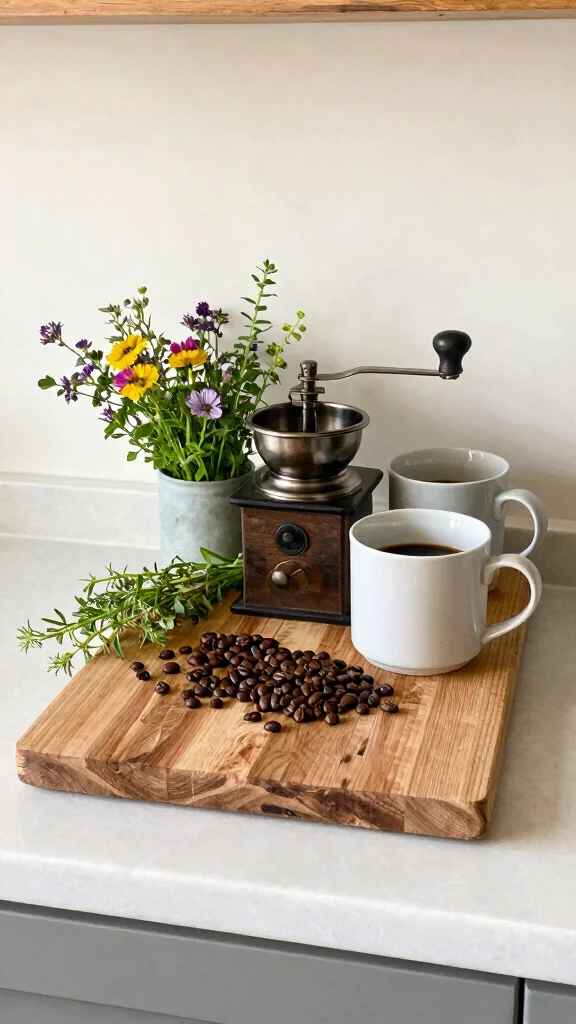Choose a breadboard that fits your countertop space perfectly. Use it to display coffee-making tools alongside beans and mugs. Pair with flowers or herbs for an extra rustic touch.