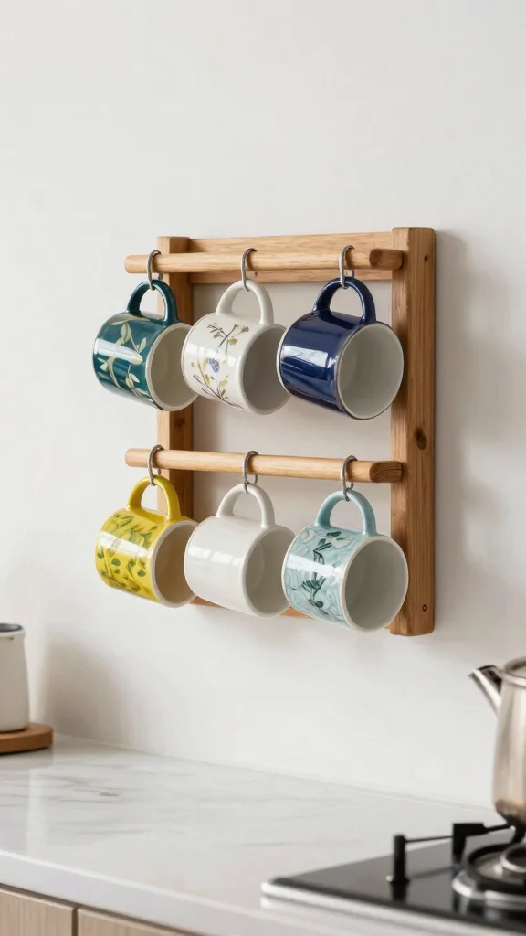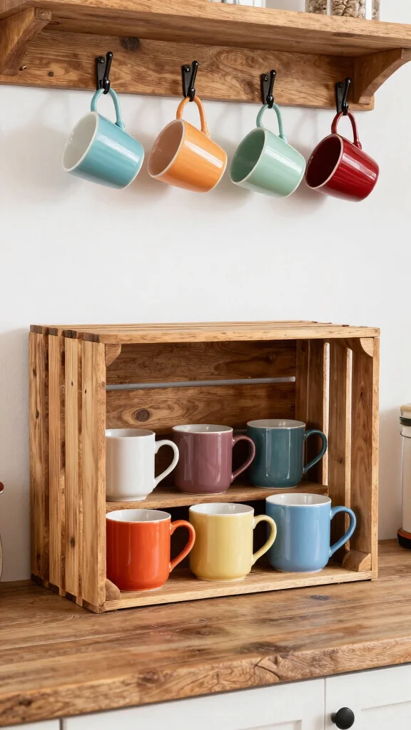 Install mug hooks beneath shelves for a unique touch. A rustic wooden crate can create an attractive display for your mugs. Hanging mugs from a decorative ladder adds a fun, bohemian vibe to your setup.