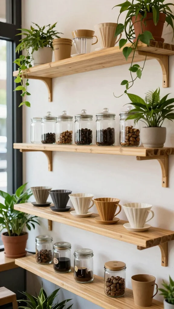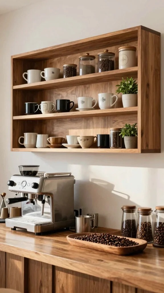 Utilize open shelves to display coffee essentials for easy access and a stylish look in small spaces.