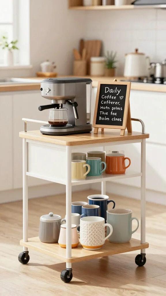 Create a mobile coffee station with a rolling cart for flexibility and added storage in tight kitchen areas.