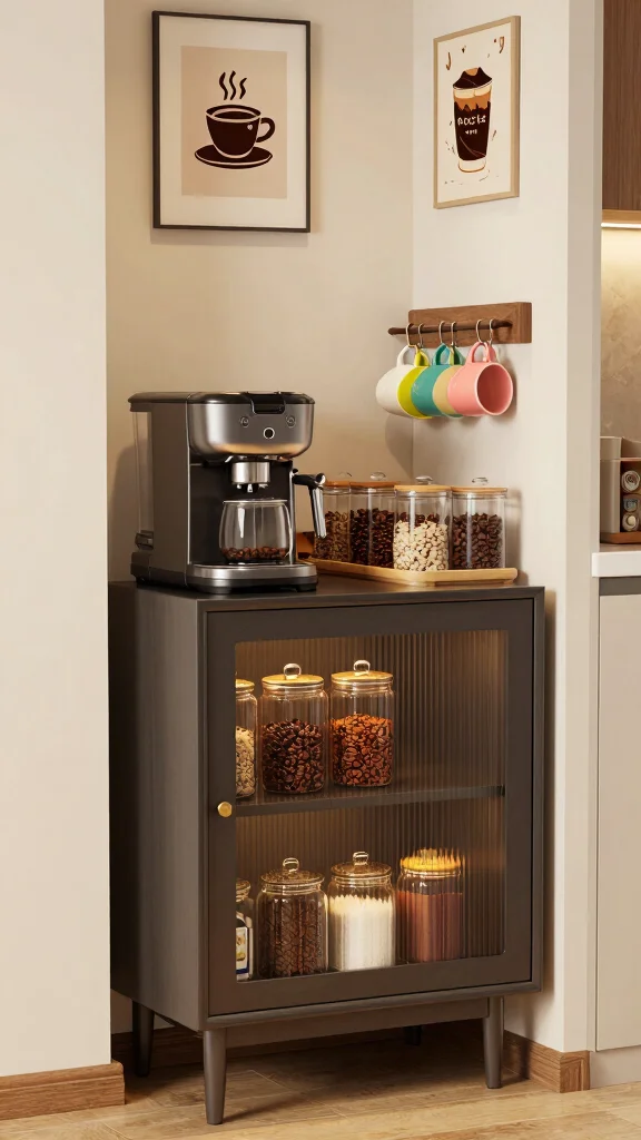 Enhance your compact coffee cabinet by adding a wall-mounted mug holder to free up even more counter space. Adorn it with your favorite coffee-themed artwork to create an inviting atmosphere. This organized setup not only maximizes efficiency but also elevates your kitchen decor.