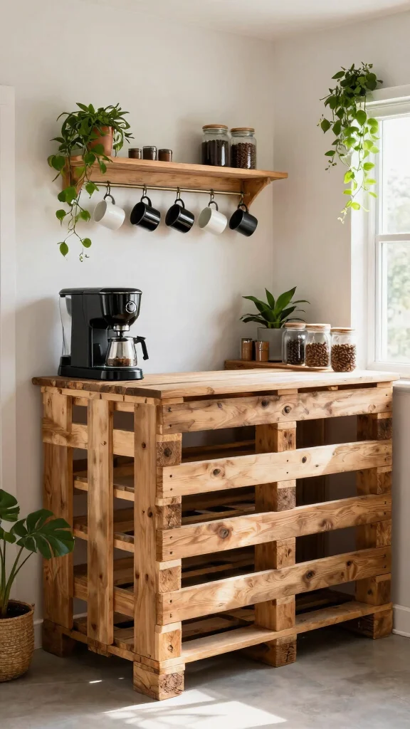 A rustic wooden pallet coffee bar can add a unique charm to your kitchen while serving as an inviting coffee station. By repurposing a wooden pallet, you create a cozy atmosphere filled with character and warmth. Imagine a setup with hooks for mugs and shelves for your coffee maker and supplies, offering a personalized touch to your daily routine.