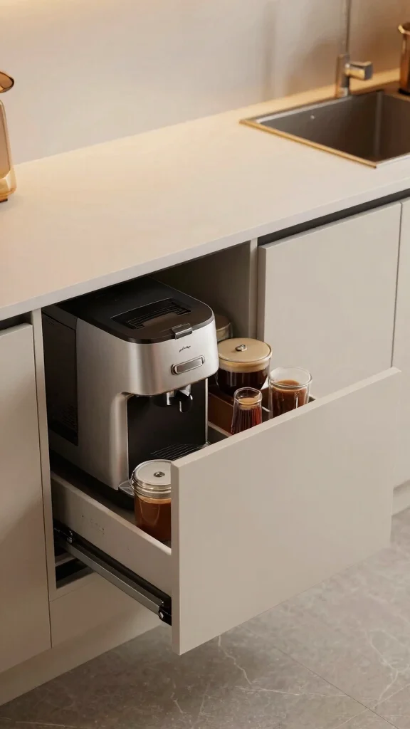 An under-counter coffee drawer is a smart way to keep your coffee essentials hidden yet easily accessible. This innovative design allows you to maintain a clean countertop while storing your coffee maker and accessories neatly away. Imagine a shallow drawer that holds your coffee machine and a pull-out tray for pods or grounds, keeping everything organized and tidy.