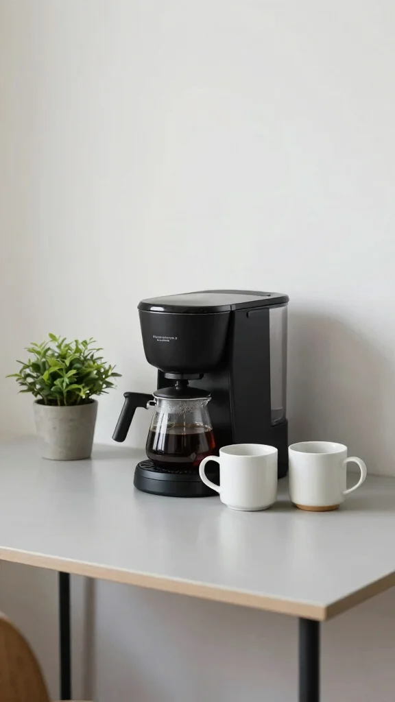 Incorporate natural elements like a small plant to infuse life into the corner, while maintaining a monochromatic color scheme for a sophisticated touch. This approach is perfect for smaller spaces, allowing you to enjoy your coffee ritual without distractions.