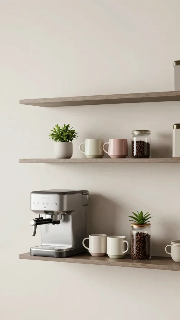 With floating shelves, you can adjust the height to suit your needs and keep your favorite items front and center. Consider adding a small plant or a decorative coffee grinder to personalize your setup. Here are some tips for perfecting your floating shelf design: