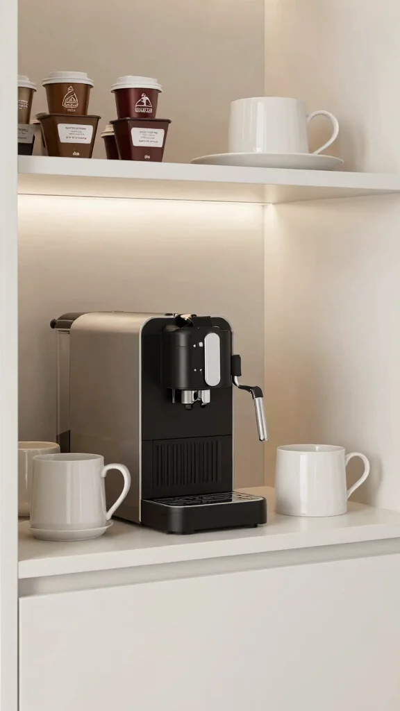 Install a pull-out shelf or flip-up tray so the machine hides away when not in use. Maximize vertical space with shelf risers, labeled canisters for beans, sugar, and creamer, and mug hooks. If you want a seamless look, mount a slim back panel that matches your cabinetry and close the doors for a tidy hidden coffee bar. Add warm lighting and a small decor touch to finish the look.