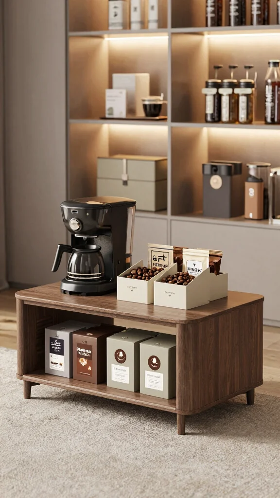 A coffee table with drawers or shelves can hold your essentials while providing a surface to brew your favorite coffee. Here are some ideas for incorporating this design: