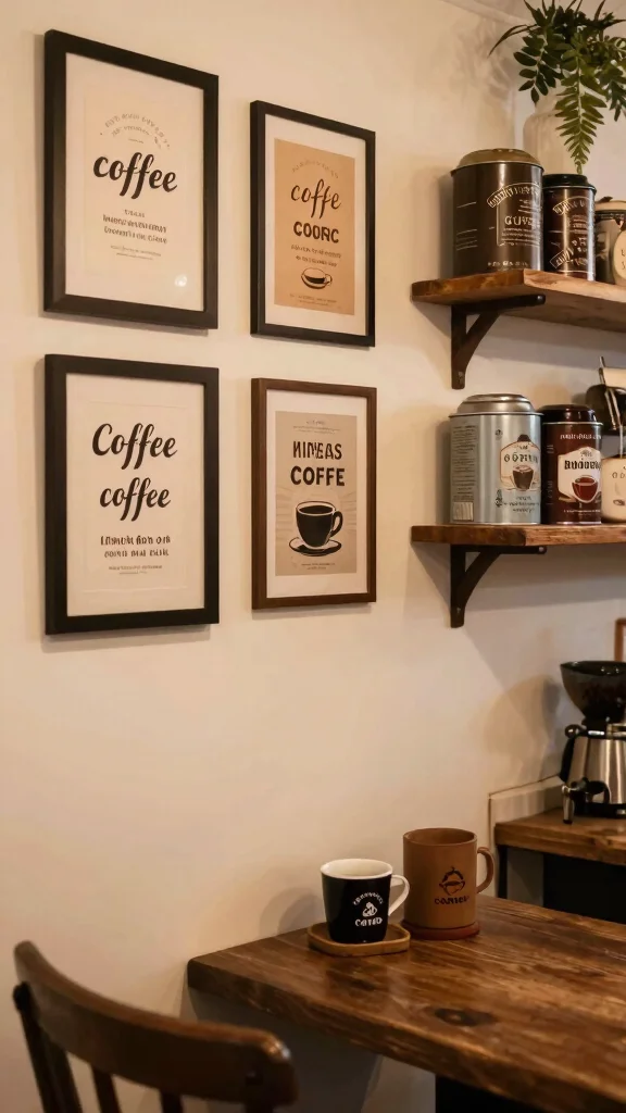 – Coffee-themed prints: Frames with coffee quotes or illustrations can add charm.