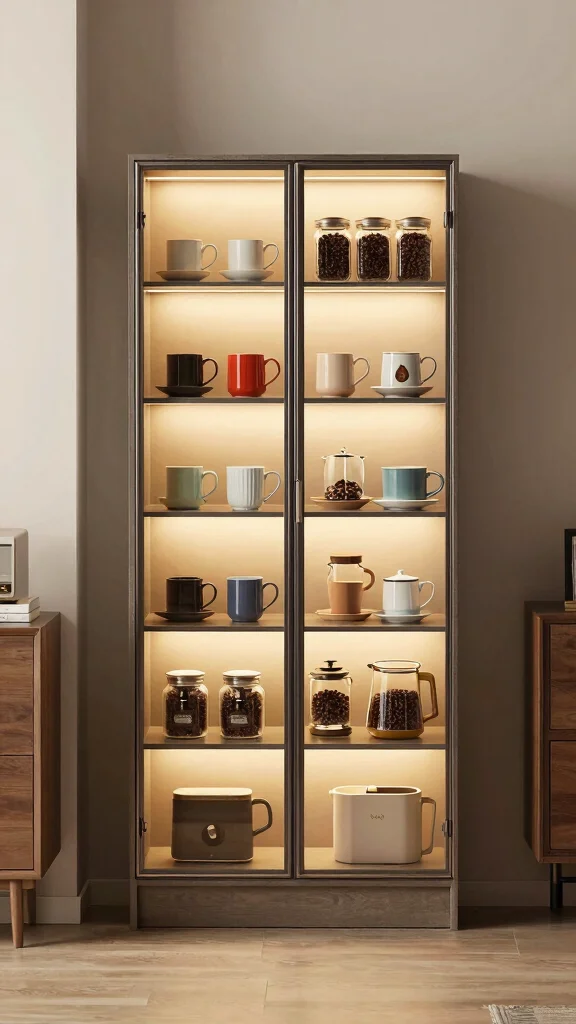 Want to turn your pantry into a stylish coffee haven? A glass door cabinet can beautifully display your favorite mugs and accessories while keeping everything visible and organized. This elegant choice adds a touch of sophistication to your space.